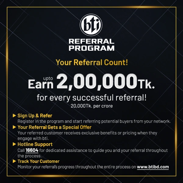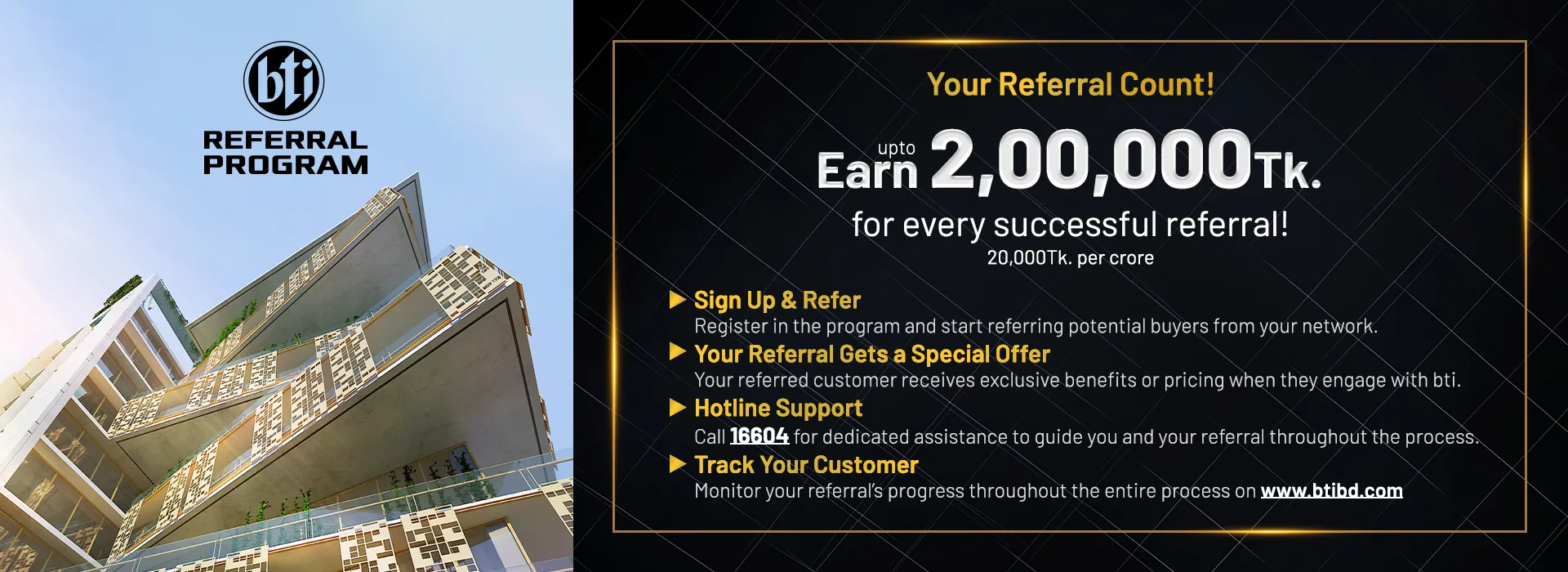 If you know someone looking for a new home, refer them to bti and be rewarded when their journey results in ownership. With a reward of up to BDT 2 lakh (BDT 20,000 per crore), this program recognizes your network and your contribution in helping others find the right home.